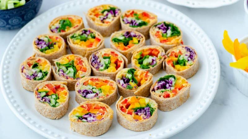 • Rainbow Veggie Wraps: Spread cream cheese or hummus onto a soft tortilla, then layer with colorful strips of carrots, bell peppers, and spinach. Roll ‘em up like burritos, slice, and serve! Kids can help build their own wraps.